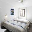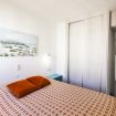 Un distribuidor nos lleva a los dos dormitorios uno doble con dos camas de 90 cm y generoso armario y otro con cama de matrimonio. y armario. Entre ambos dormitorios un baño completo con ducha y zona de lavandería completan la vivienda En la azotea del edificio, hay una terraza solarium donde es fácil tender o tomar el sol con tranquilidad disfrutando de las bonitas vistas.